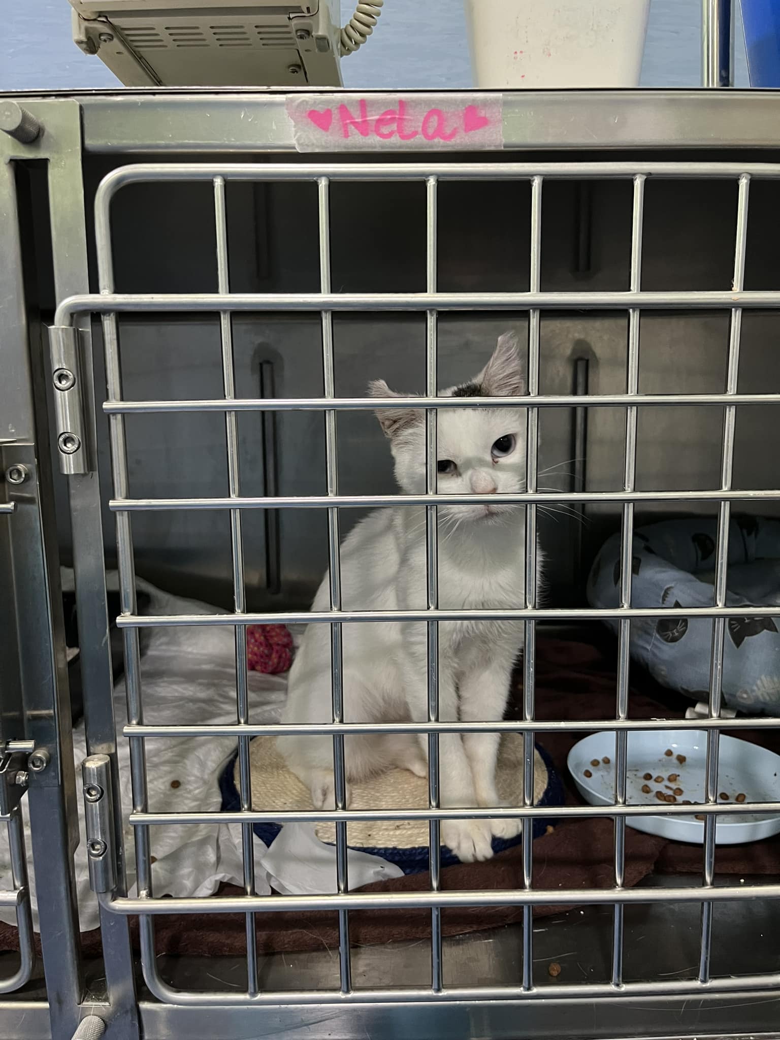 Nela fue operada: se le tuvieron que extraer los dientes y le recortaron las orejas debido al cáncer de células escamosas que padece. A pesar de todo esto, debería poder hacer una vida completamente normal. Pero no puede, porque sigue metida en una jaula desde hace meses…